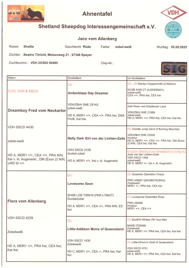 gew. 02.11.2018, HD A2, MDR (+/+), frei von erbl. Augenerkrankungen, CEA gen. Carrier, vollzahnig